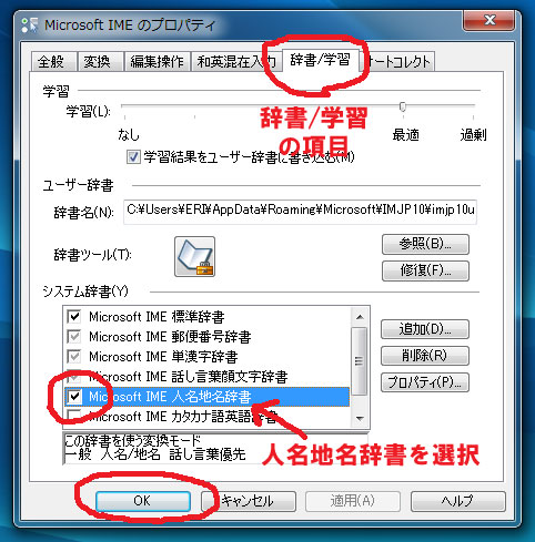 3.[辞書/学習]の項目で、[Microsoft IME 人名地名辞書]にチェックを入れ、[OK]を押す