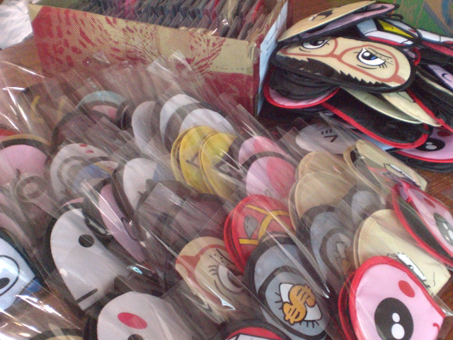 大量のおもしろアイマスクに囲まれ、ラッピング作業中です。