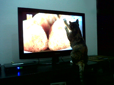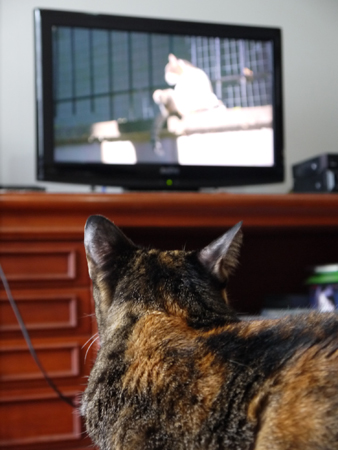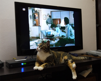 「鶴太郎やさんまなんかより自分を見てくれ!」、とばかりにテレビの前を陣取るネコ。