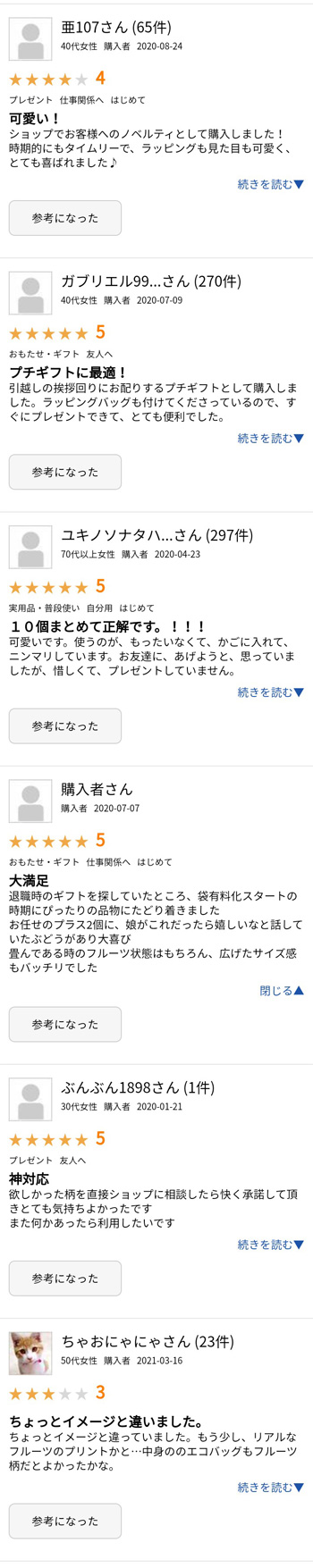 とてもかわいい!と大好評でした。いろいろなフルーツのエコバックはどれも欲しくなるみたいで、全種類欲しい!と言われました。退職のお礼ギフトに使用しました。かわいい商品ありがとうございました。(姉妹店ヤフーショッピングレビュー)